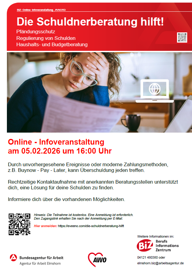 Onlineveranstaltung am Donnerstag, den 05. Februar 2026 um 16:00 Uhr  Durch unvorhergesehene Ereignisse oder moderne Zahlungsmethoden, z.B. Buynow - Pay - Later, kann Überschuldung jeden treffen. Anke Schmidt von der Schuldner- und Verbraucherinsolvenzberatung AWO Schleswig-Holstein gGmbH informiert über die Unterstützungsmöglichkeiten. Hinweis: Die Teilnahme ist kostenlos. Eine Anmeldung ist erforderlich. Den Zugangslink erhalten Sie nach der […]