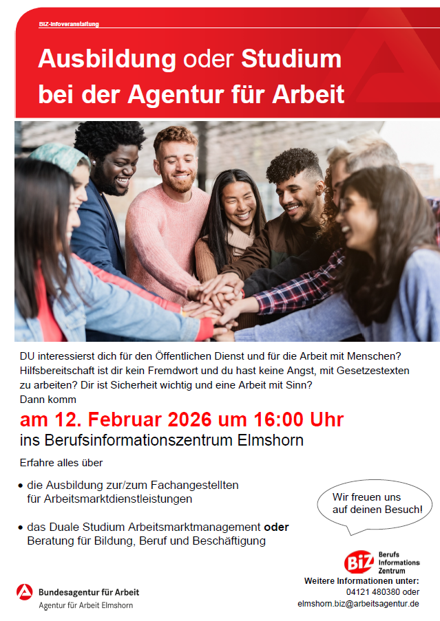 Vor-Ort-Veranstaltung am BiZ am Donnerstag, den 12. Februar 2026 um 16:00 Uhr im BiZ Elmshorn DU interessierst dich für den Öffentlichen Dienst und für die Arbeit mit Menschen? Hilfsbereitschaft ist dir kein Fremdwort und du hast keine Angst, mit Gesetzestexten zu arbeiten? Dir ist Sicherheit wichtig und eine Arbeit mit Sinn? Erfahre alles über die Ausbildung […]